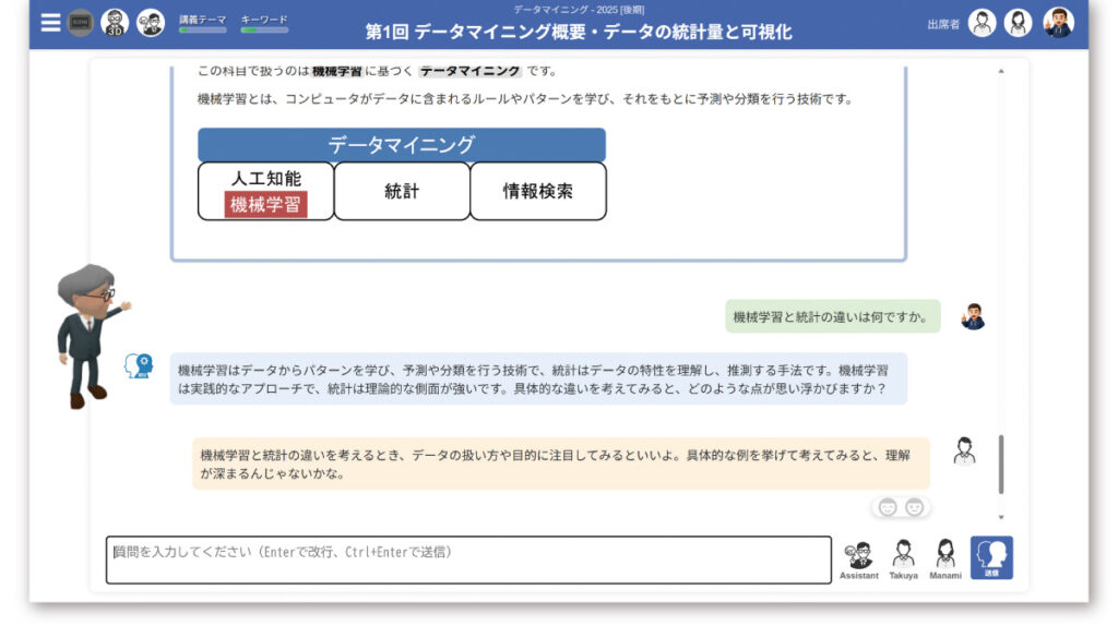 「HIUブレイン」は、印刷授業の学習の際に利用できる生成AIを利用したチャット型学習支援システムで、学生一人ひとりの習熟度に合わせてAI講師と対話しながら個別に授業が進められます。プログラミングをサポートする専門のAIアシスタントや、一緒に学ぶ立場からアドバイスをくれるバーチャル・クラスメイトも登場し、より理解を深めることができます。